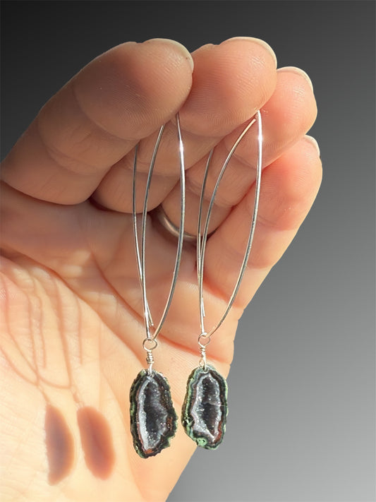 Long Crescent Hoop Earrings with Tabasco Geodes