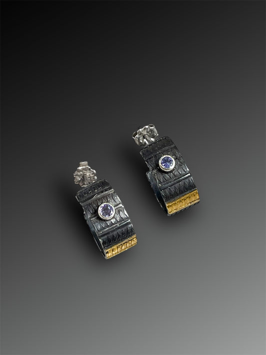 Tanzanite and Keum-Boo Textured Hoop Post Earrings, Artisanal Silver Jewelry, Slow-Made Goods, Art Jewelry, Hand Fabricated Handmade Metalwork