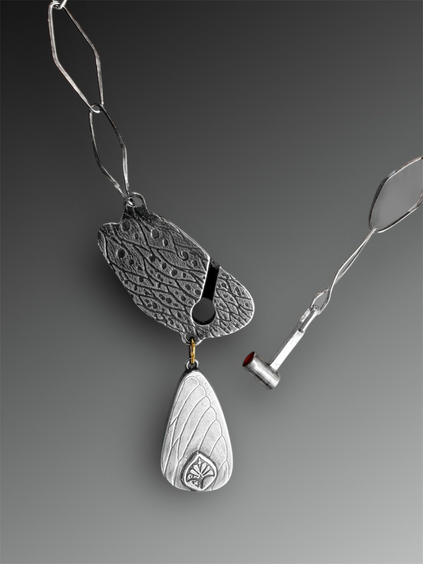 This unique statement necklace features a domed cicada wing hollow form through which a fire opal key is inserted to serve as the clasp. 18k gold accents the front, and a beautiful blue and white turquoise hangs from the wing, encased in 18k gold. The back shows an original pattern and another impression of a cicada wing. The loop linking the turquoise to the rest of the necklace is also 18k gold. I have handmade the 20" chain and given the silver an antiqued patina with a matte finish.