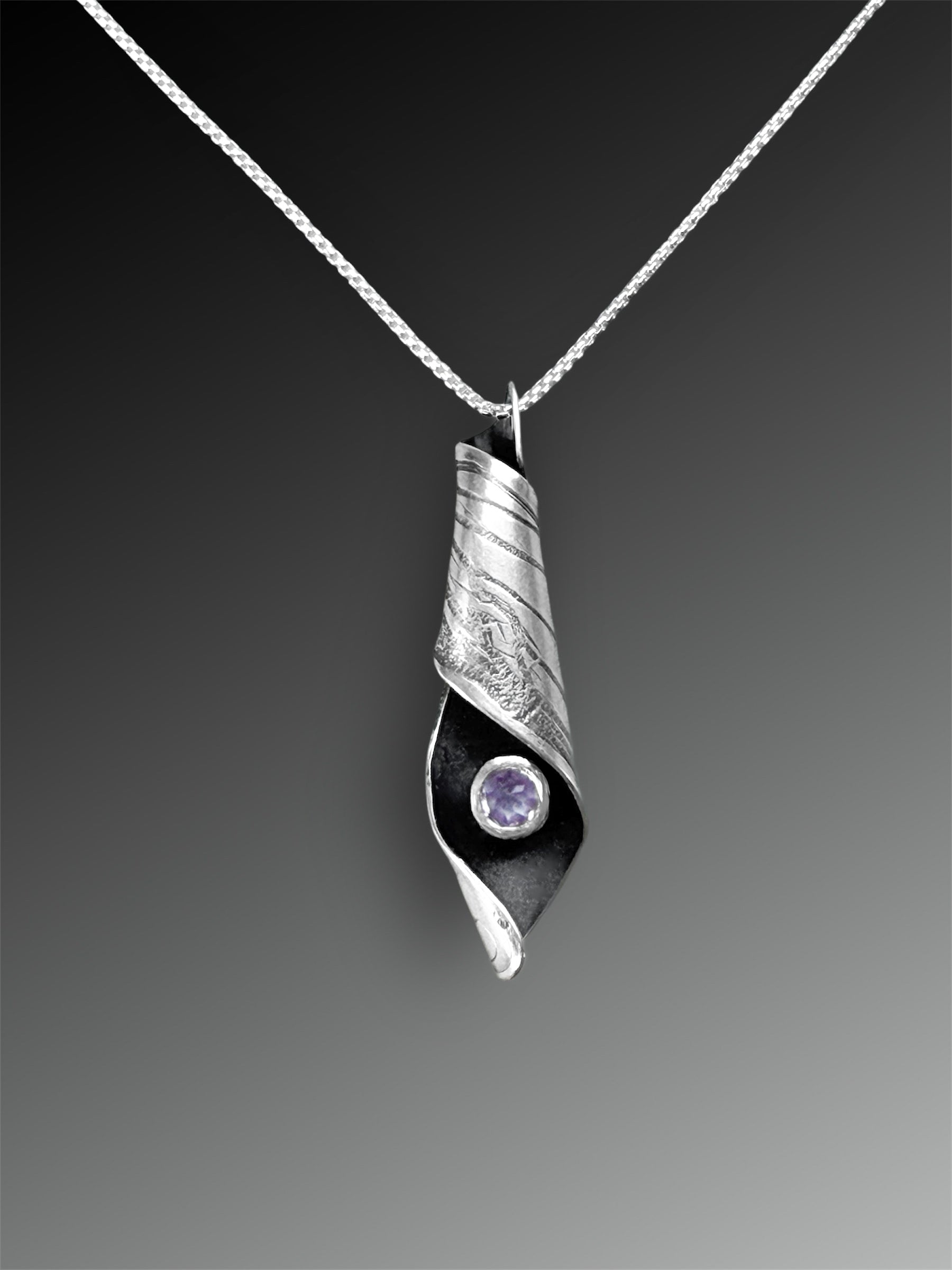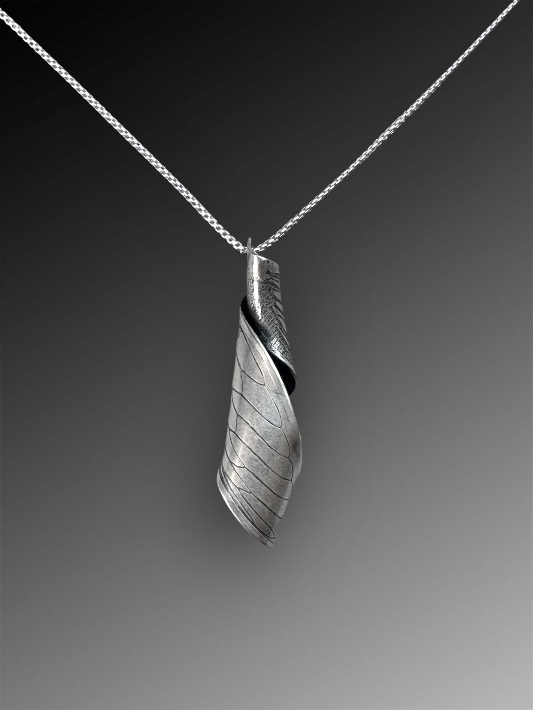 This necklace was made by pressing a large cicada wing into argentium silver, then curling the wing around a large faceted amethyst. I have given the silver a patina and a satin finish.