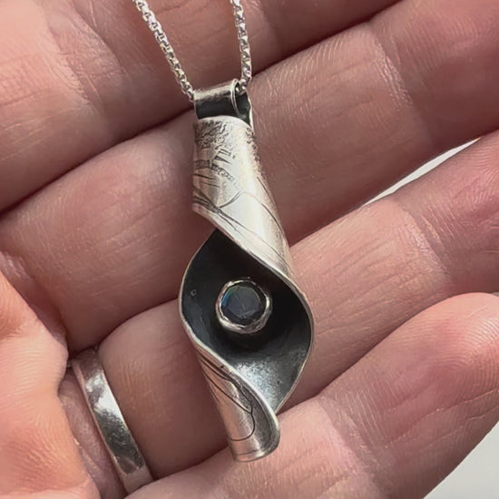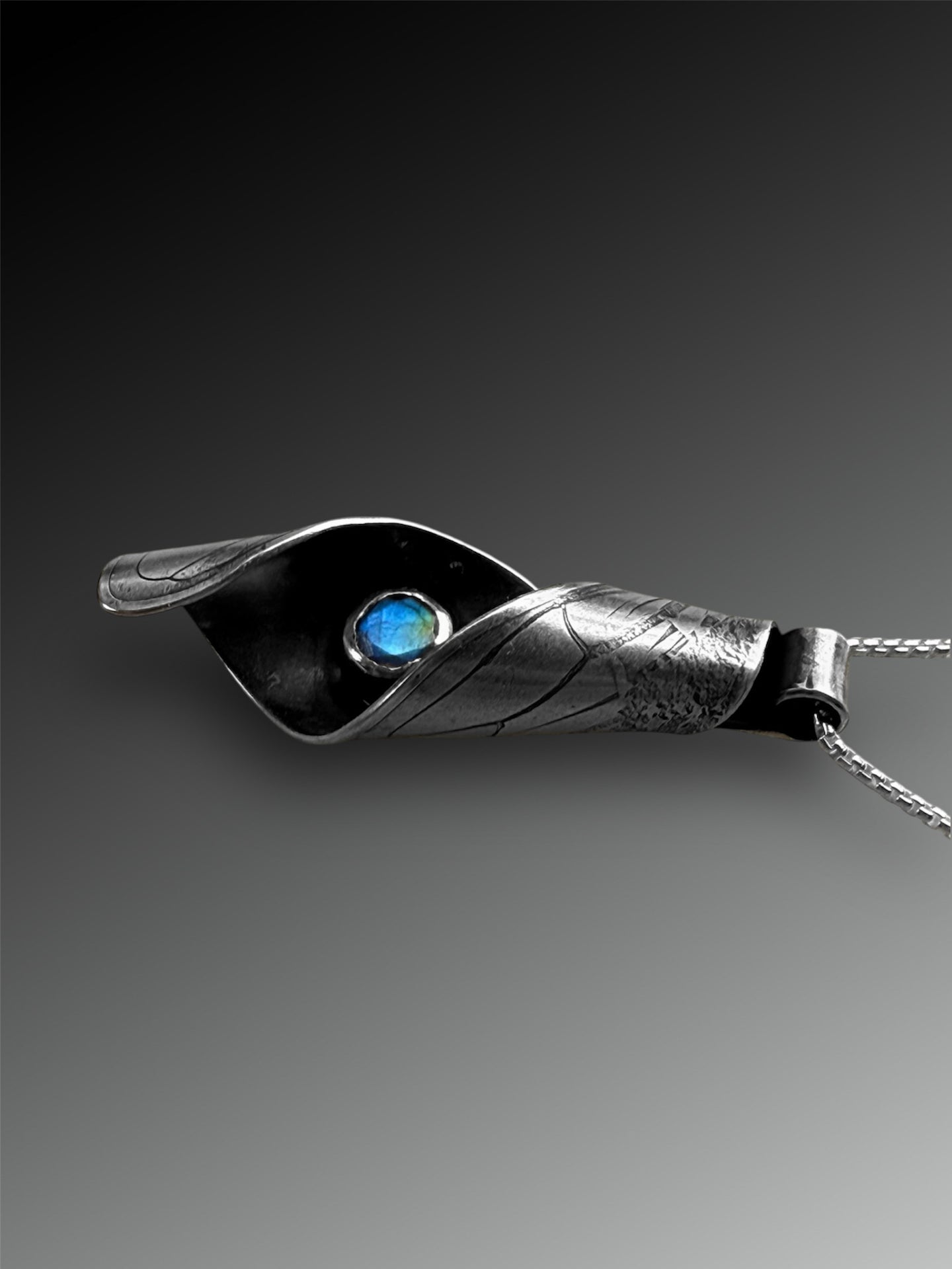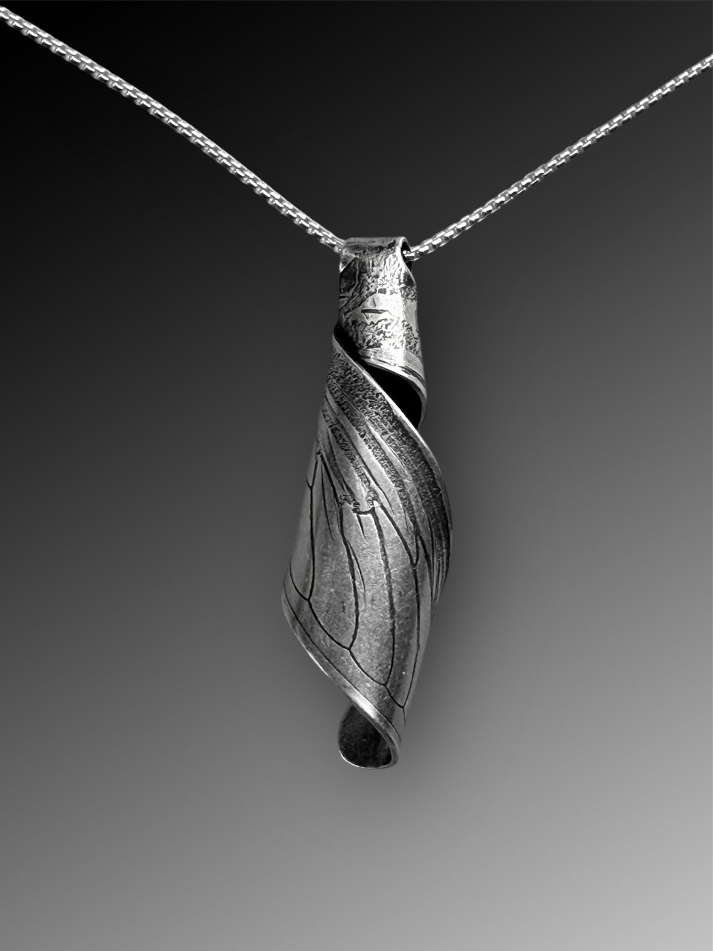 This necklace was made by pressing a large cicada wing into argentium silver, then curling the wing around a large faceted labradorite. I have given the silver a patina and a satin finish.