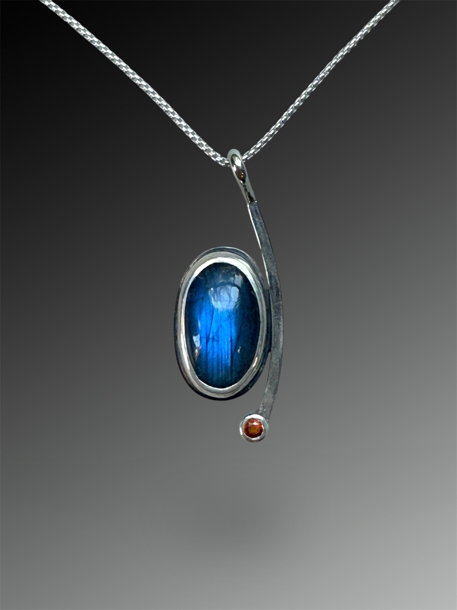 A brilliant, flashy blue labradorite floats beside a crescent bar, with a faceted orange sapphire accenting the end. The back has a floral Art Nouveau pattern. I have given the silver a patina and a shiny finish.