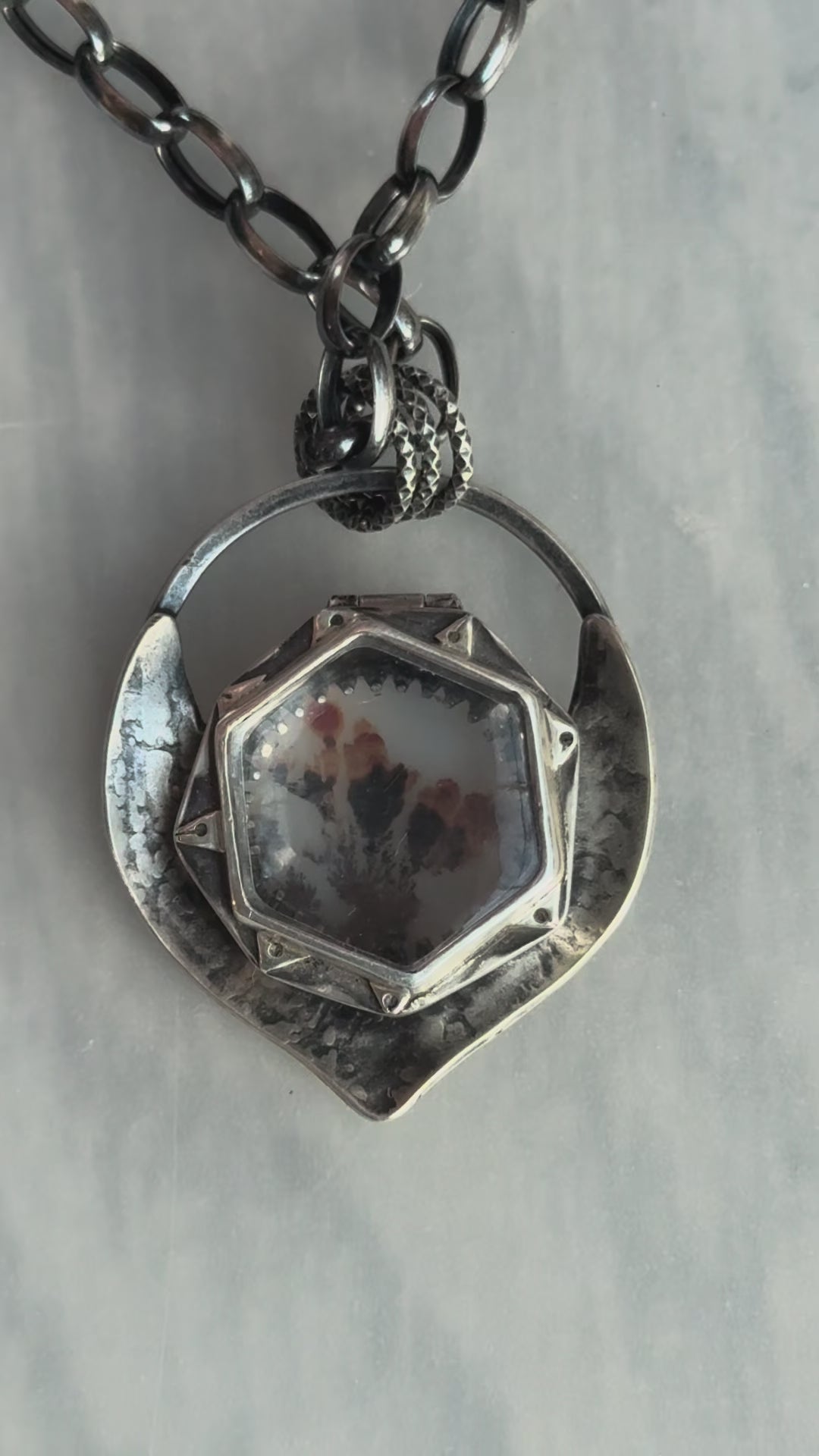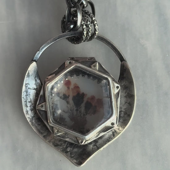 Behind a crystal-clear natural Himalayan quartz lies a collector's specimen of colorful, floral dendritic agate. The quartz magnifies the inner stone when the locket is closed, opening to reveal the stone itself. The locket can also be personalized by placing a photo or other small object over the flat stone so it can be seen through the quartz when closed. The back has an original pattern, and I've given the piece an antiqued patina and a matte finish.