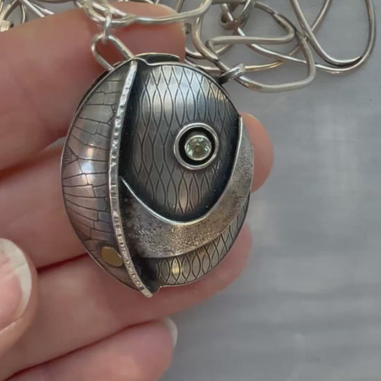 This substantial necklace has many details integrated into an original, contemporary design. I have constructed it with hollow form layers and overlays inside an oval silhouette. On the front is an 18k gold spot, subtly fused gold dust on the curved bridge overlay, and a brilliant teal Montana sapphire. The stone is on a “key” that serves as the clasp for the necklace, inserted and removed through a slot on the back and rotated to lock into place. The back also holds another secret: the geometrically patterned back layer flips up to reveal a small hidden compartment.
