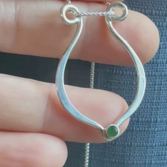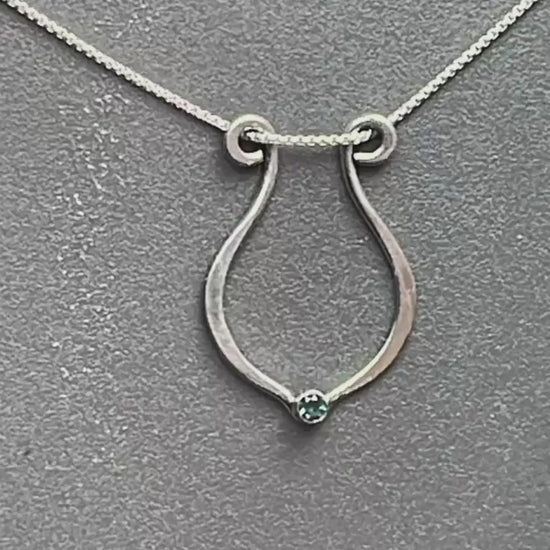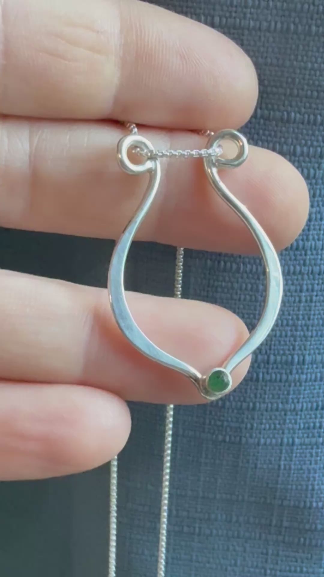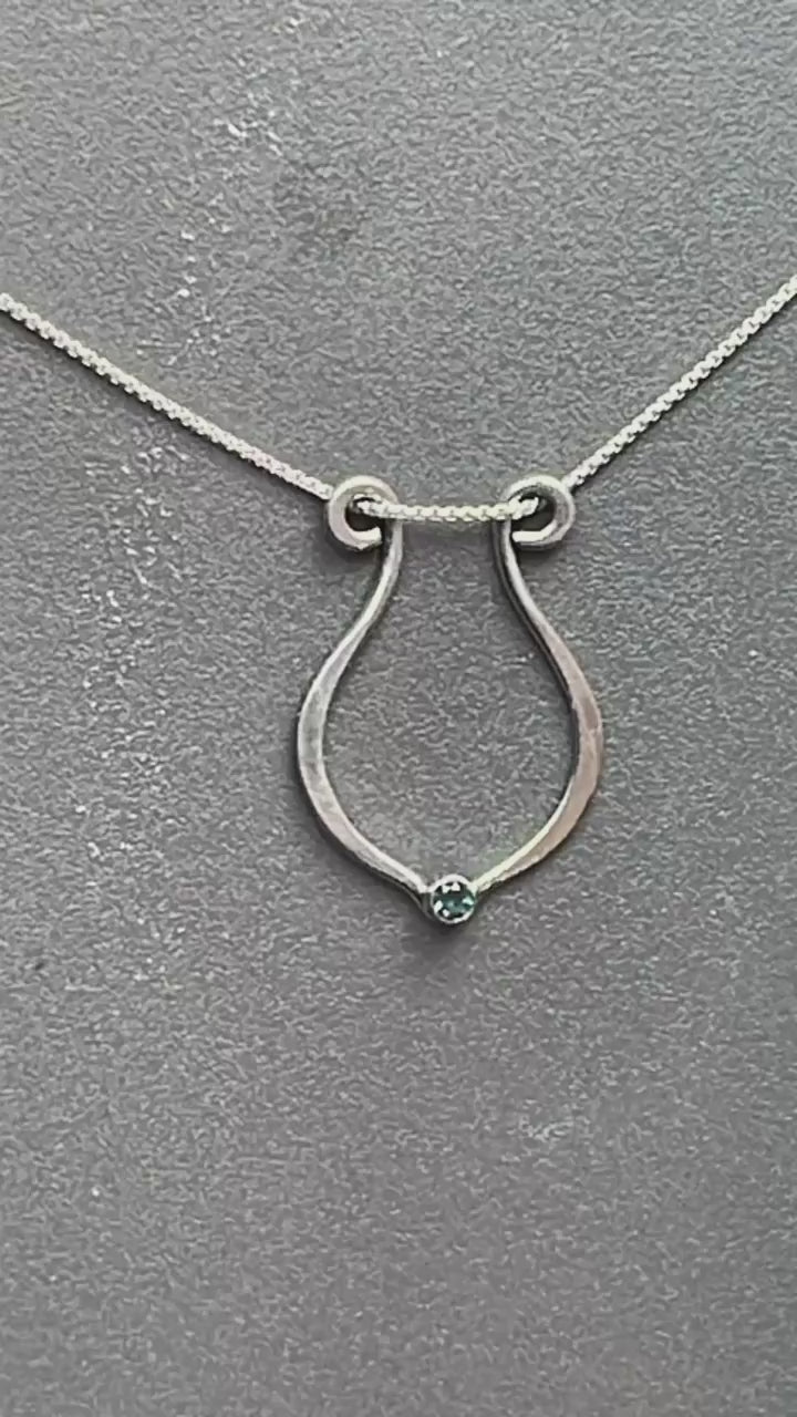 This lyre-shaped necklace can be used to carry a ring around one's neck. Your ring (ring not included) can be placed onto the lyre frame without taking the necklace off. Simply thread the necklace through your ring from one end to the other, letting the chain follow, then sliding the ring over both loops to rest on the curved sides. See the second video (with a similar necklace) for demonstration.