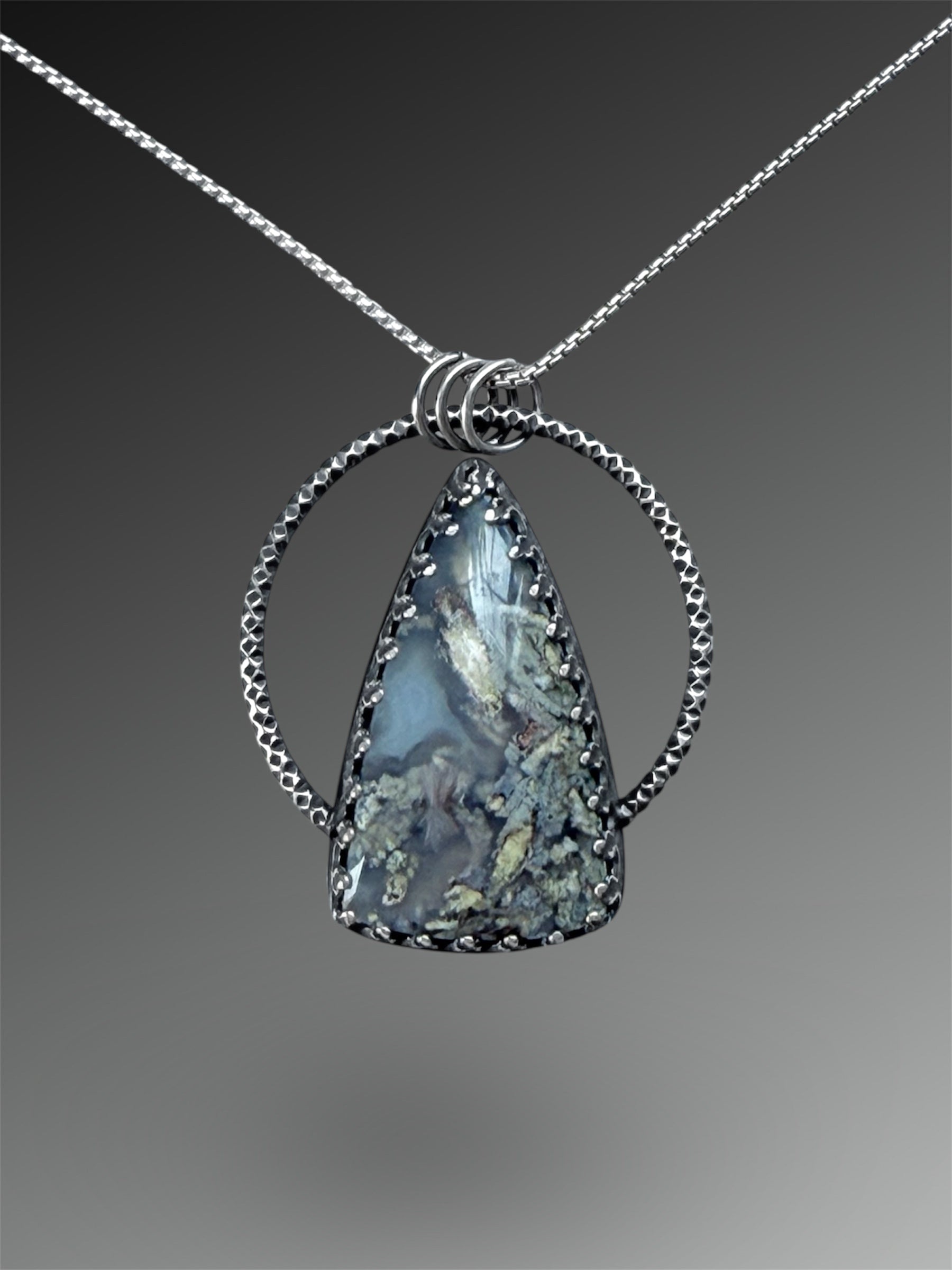 I have set this green and white moss agate in a pronged gallery bezel inside a circular bail. The bail slides around inside the three rings, like a compass point finding north. The back is patterned and I have given the silver a patina and a matte finish.