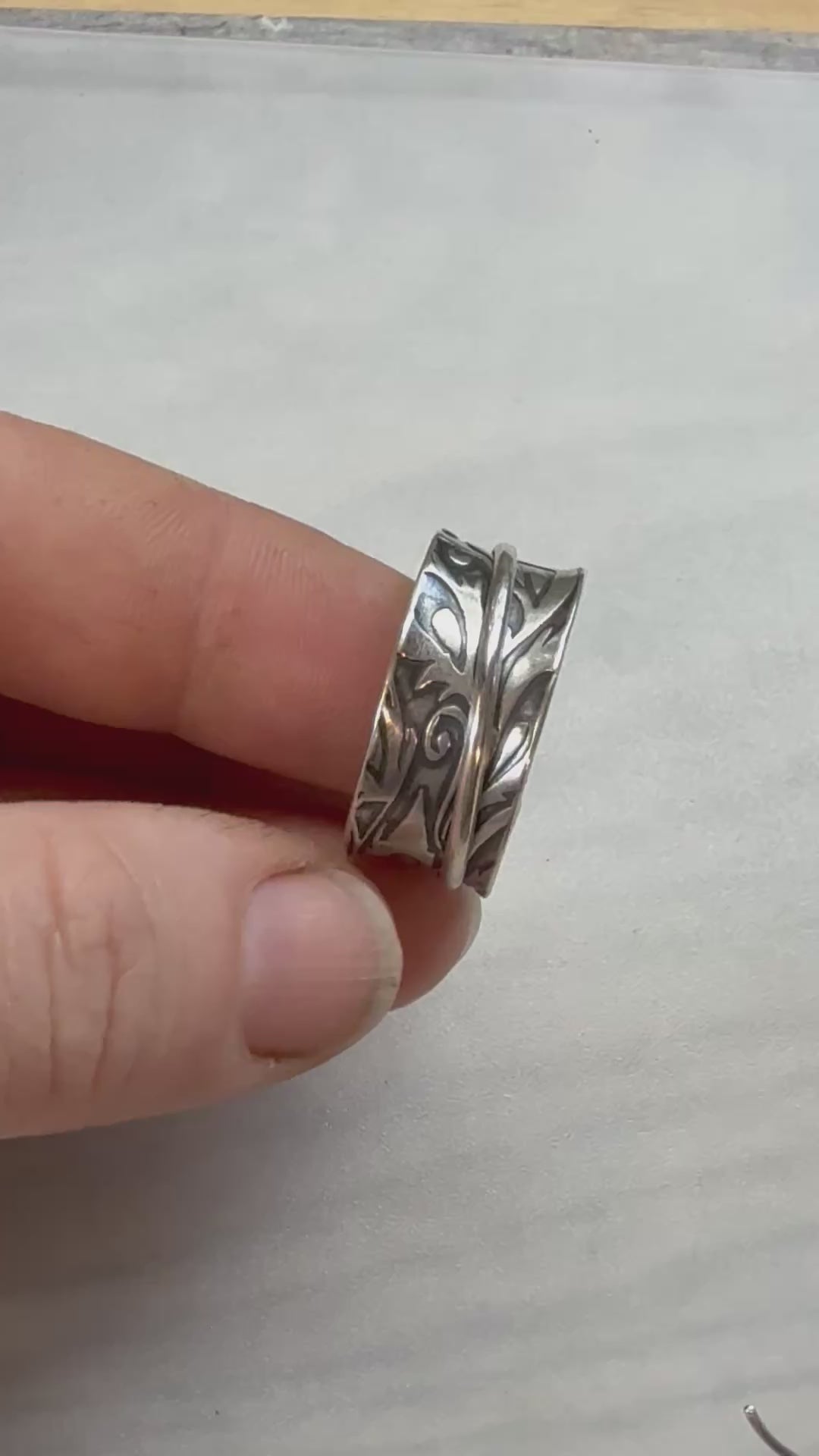 This spinner ring features a swirling feather pattern and a freely spinning half-round center ring. The inside is patterned with leaf veins.