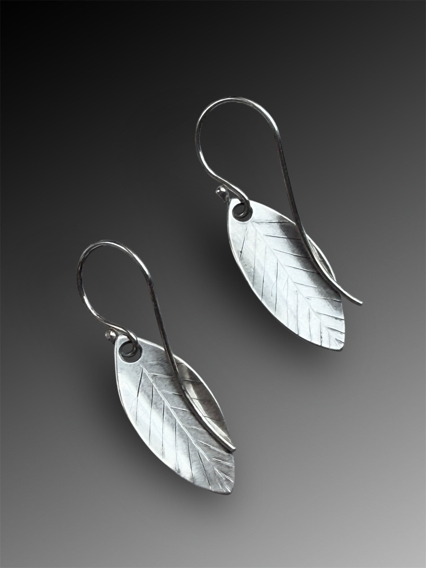 These lightweight sterling silver leaf earrings are patterned with a zentangle-like design on the front and lightly engraved leaf vein ribs on the back.