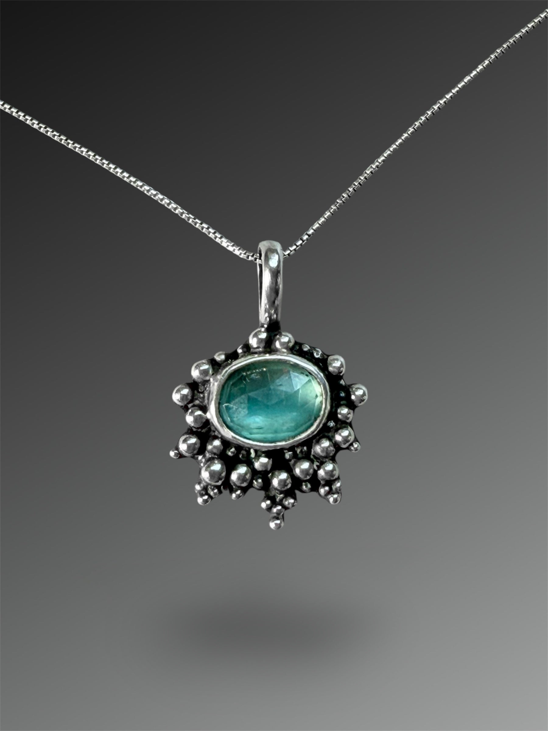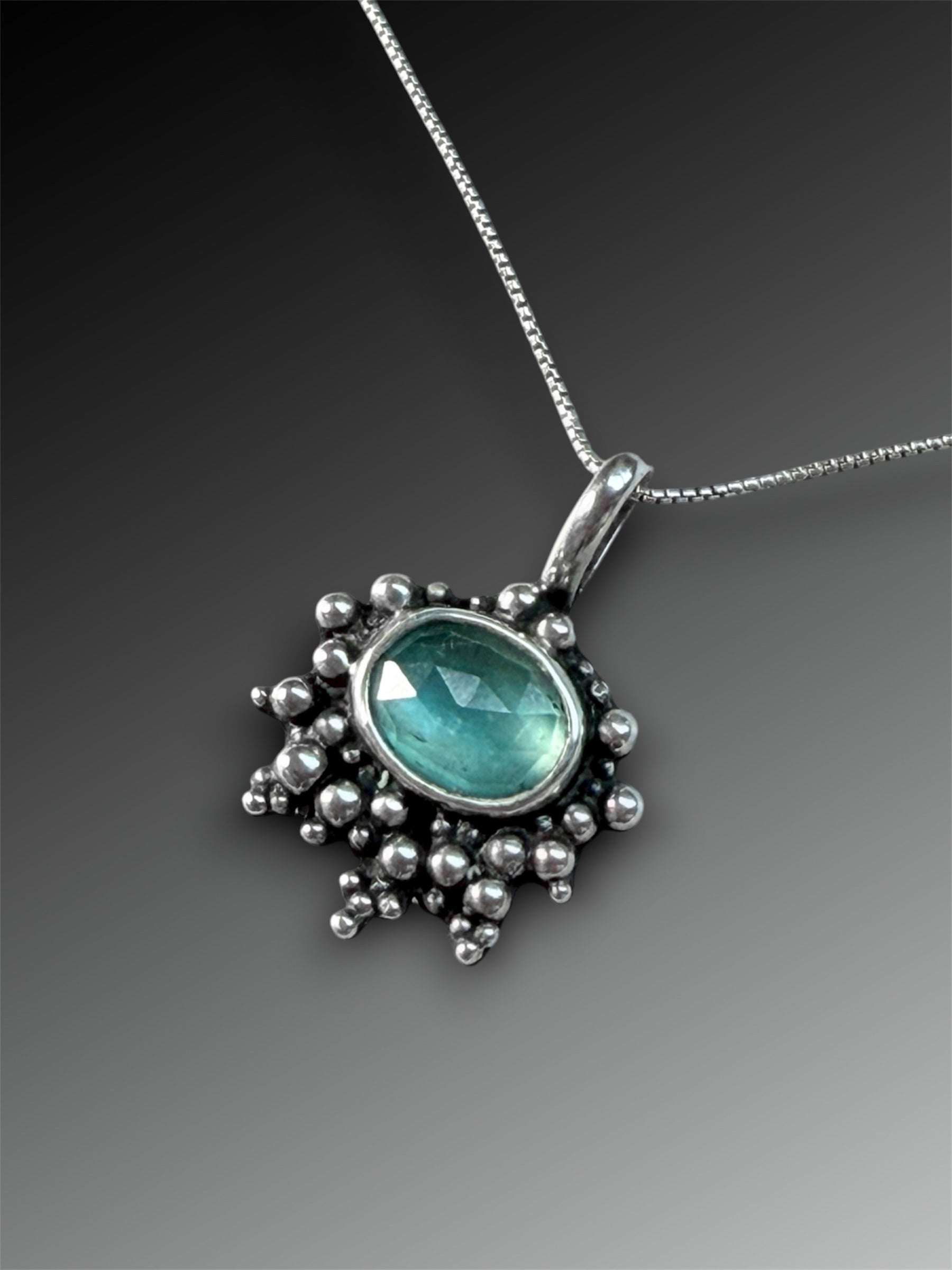 A limpid blue-green imperial kyanite is surrounded by a cluster of silver granules, like bubbles of sea foam. The back is patterned with an original hand-drawn orbicular design. I have given the silver a dark patina and a matte finish.